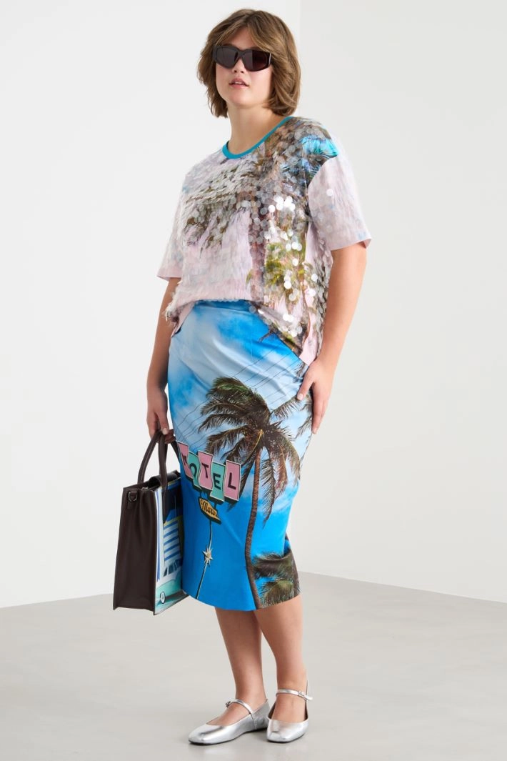 Slim-fit pencil skirt in printed cotton satin, with a zipped vent on the reverse. Rear zip fastening. Lined.