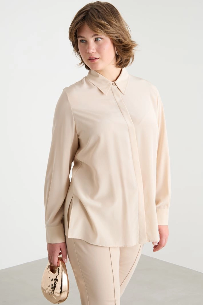 Straight-cut blouse in silk crepe de chine, with a pointed collar, long sleeves finished with buttons, and side slits at the hem. Concealed button fastening.
