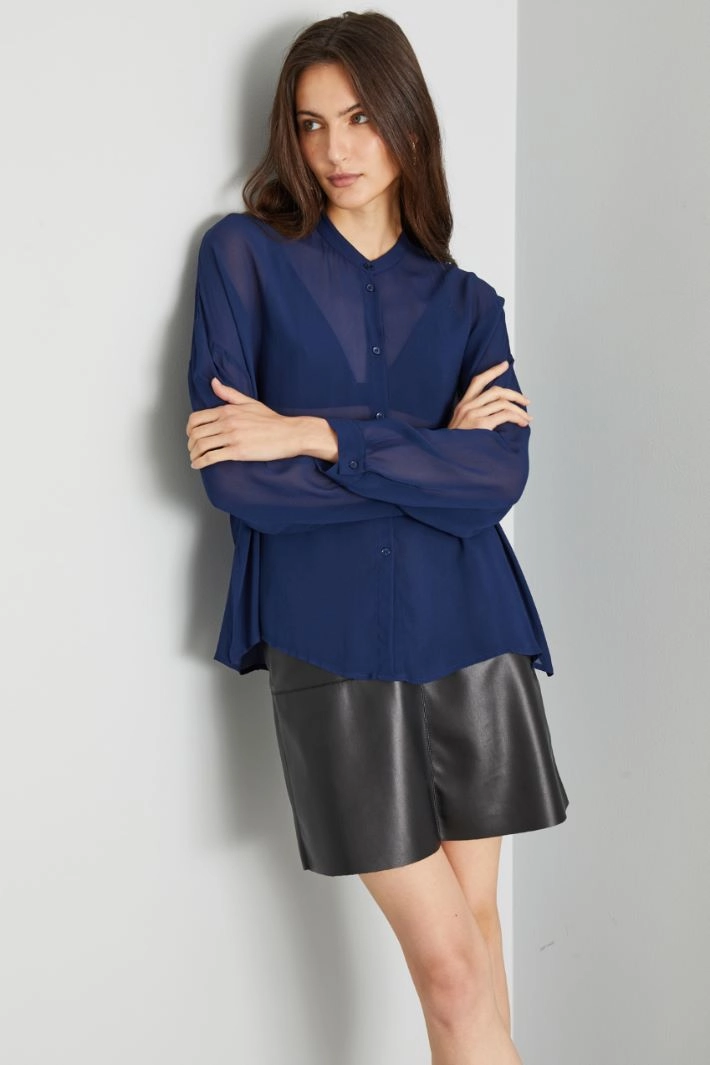 Flowing shirt in viscose georgette, with Mandarin collar, long sleeves with cuff and button, side slits. Button fastening.