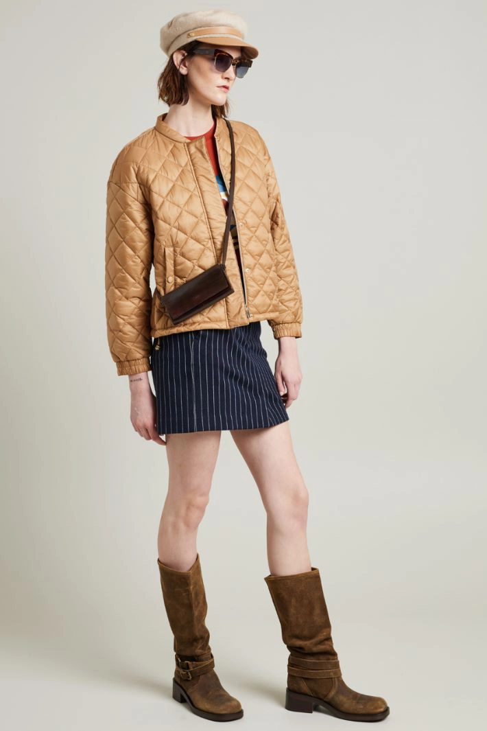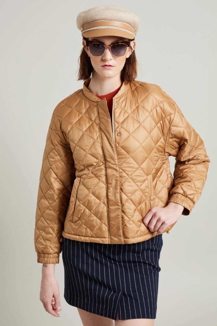 Short padded and quilted bomber jacket with stand-up collar, long sleeves with dropped shoulders and elasticated cuffs, buttoned welt pockets on the front, concealed zip and press stud fastening, drawstring at the bottom. Lined.