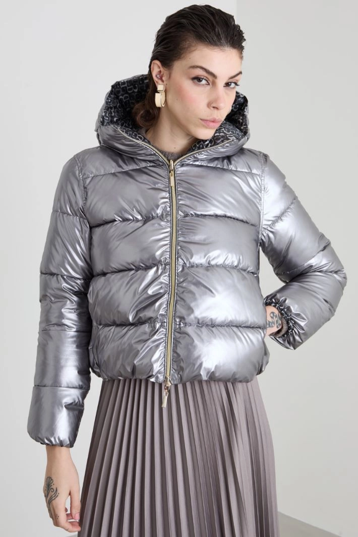 Quilted padded jacket with a straight fit in coated technical fabric with a laminated finish, with hood, long sleeves with elastic insert at the wrist and inset side pockets. Fastening with a double slider zip. Reversible model.