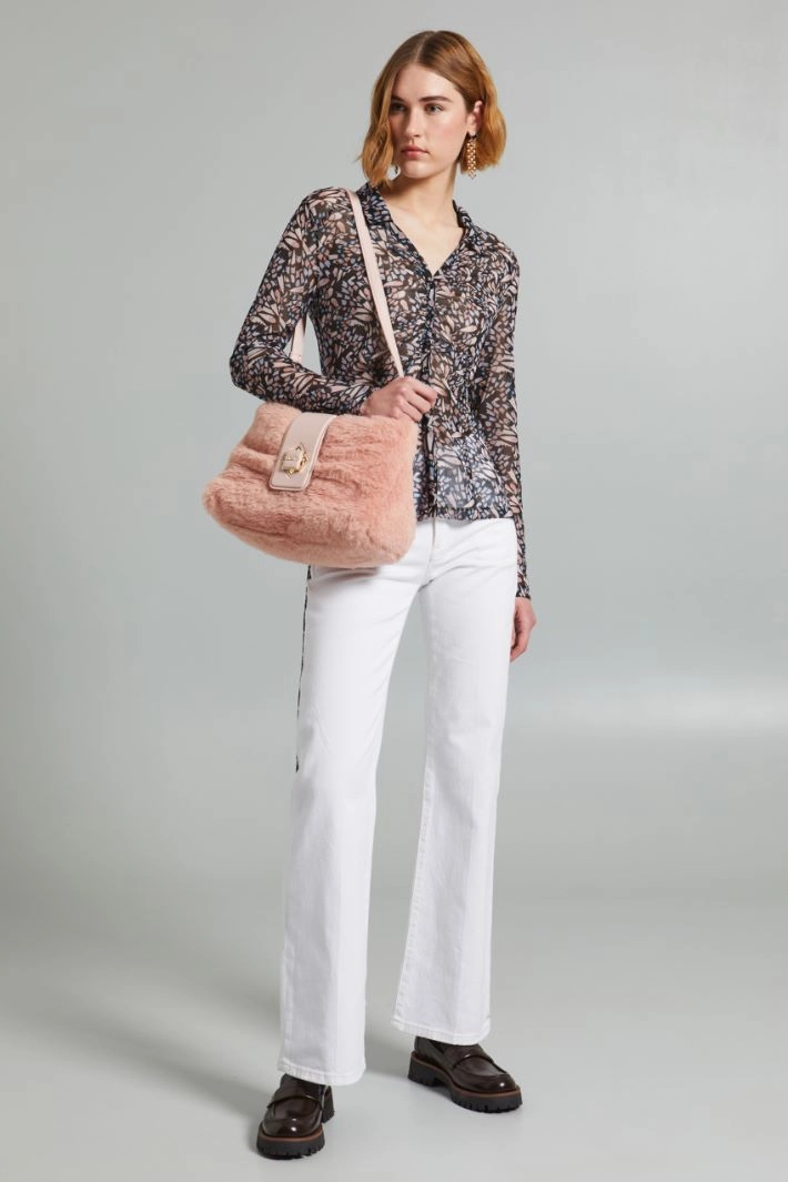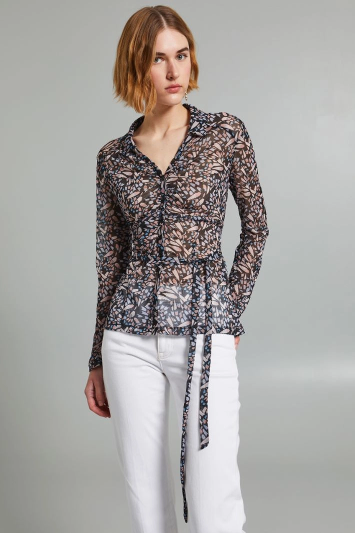 Slim-fit blouse in all-over printed crepe tulle jersey, with gathered pattern, shirt collar and V-neck, long sleeves, ribbons to tie at the waist and button fastening.
