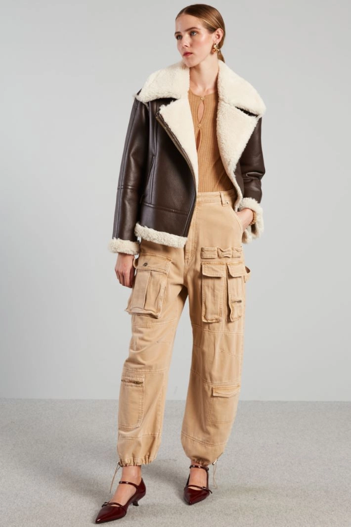 Sheepskin effect jacket in faux leather, with lapel collar, long sleeves, side pockets with zip and asymmetric double-slider zip fastening on the front. Interior in plush effect fabric.