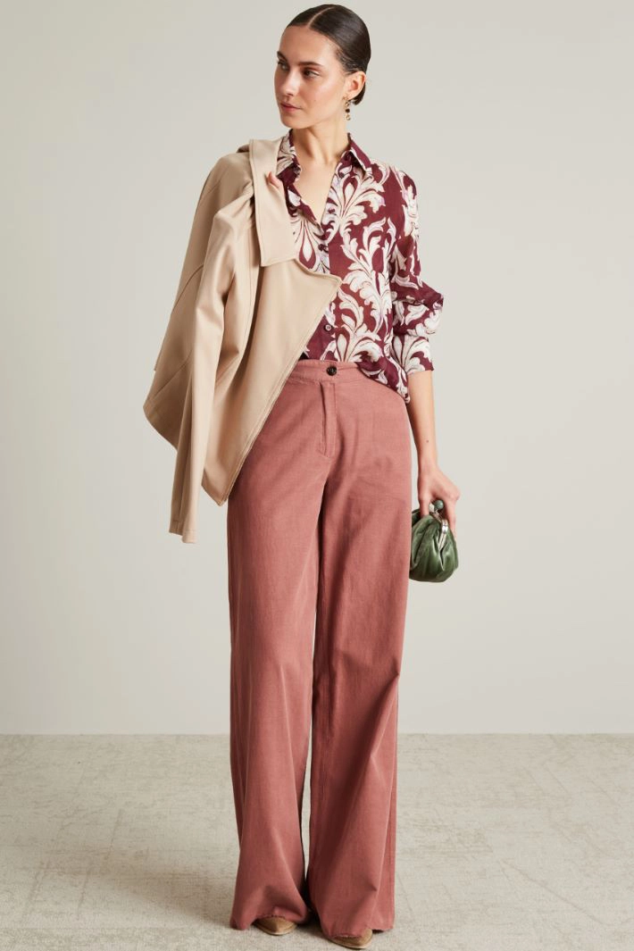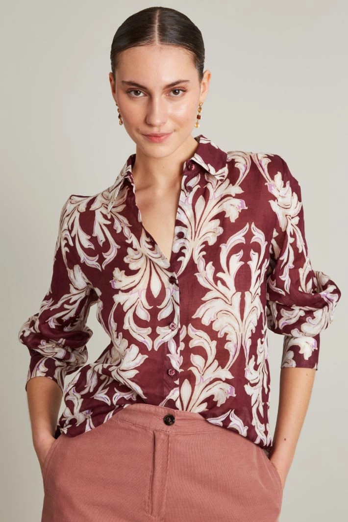 Straight-cut shirt in printed pure natural fibre voile, with classic collar, long sleeves with cuff and button, yoke at the back and fastening with matching buttons.