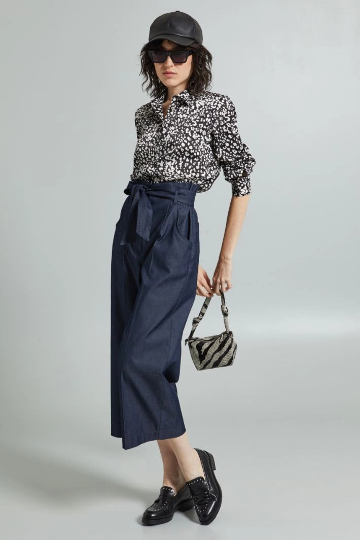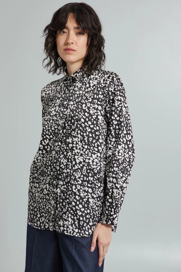 Fluid shirt in all-over printed twill, with classic collar, long sleeves with covered cuff and button, yoke cut with box pleat on the back and hidden button fastening.