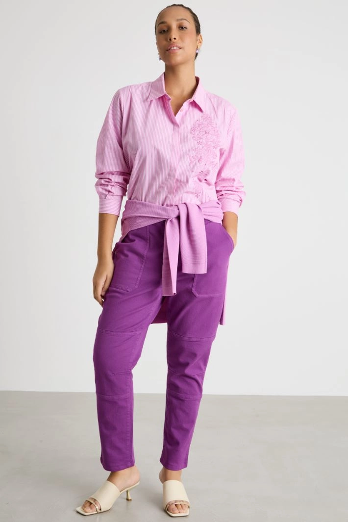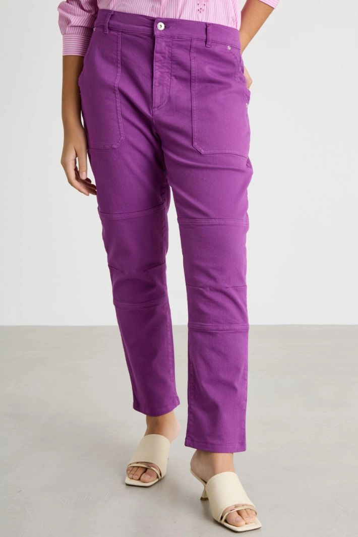 Slim-fit trousers crafted in bull denim. This pair features belt loops, front slash pockets, top-stitched seam detailing at the knee and rear patch pockets. Zip and button fastening.