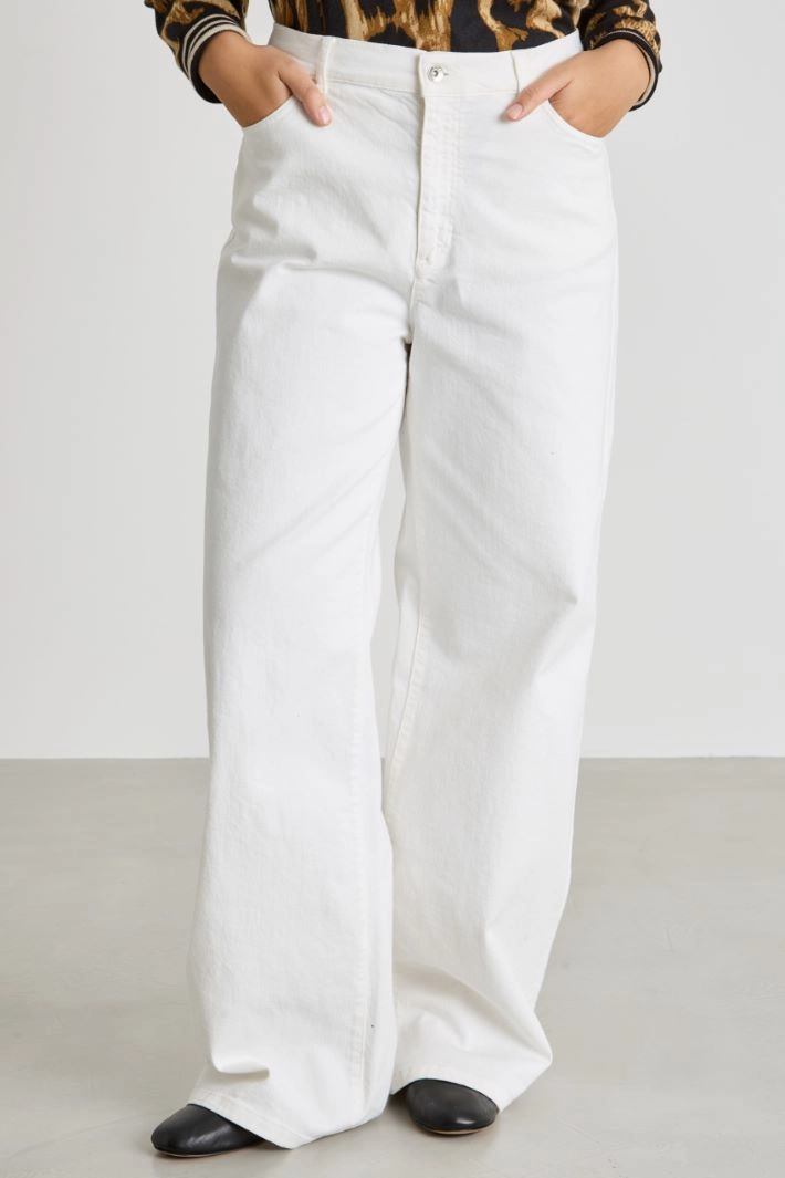 Palazzo trousers crafted in stretch-cotton bull denim, featuring belt loops, scoop pockets at the front, and patch pockets at the back. Fastening with a button and a concealed zip.