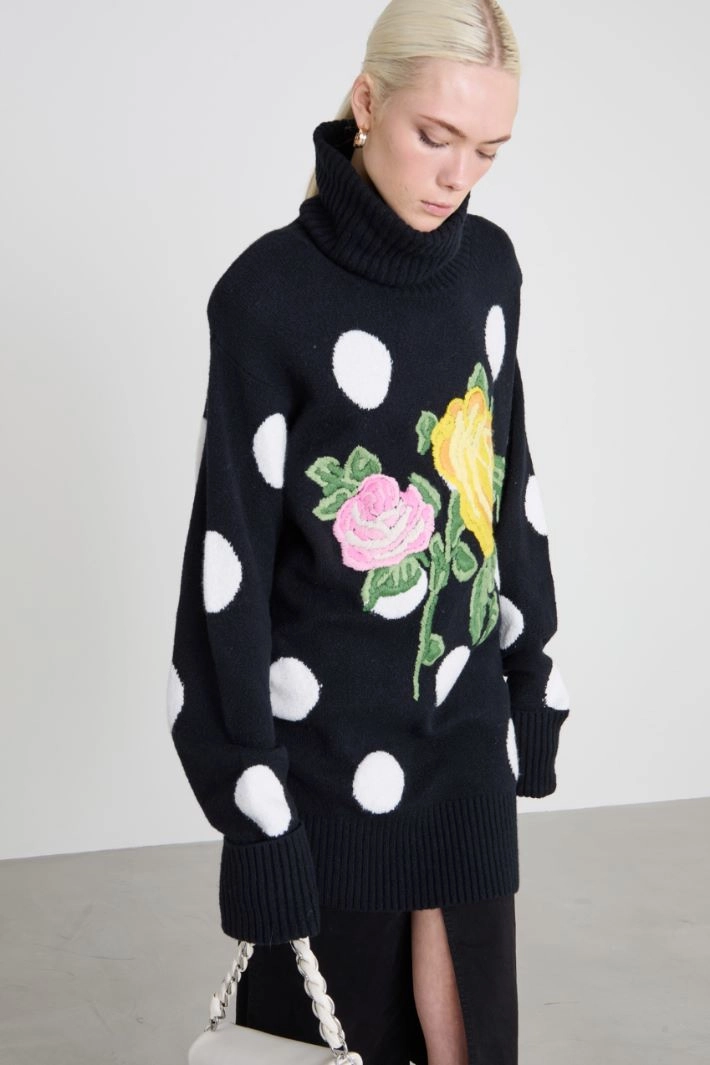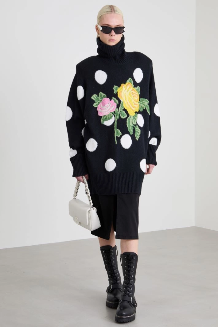 Oversized maxi sweater in stretch cotton blend yarn, with embroidered motif, high collar with turn-up, padded shoulders, long sleeves with dropped shoulders and ribbed trim.
