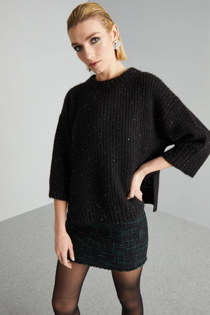 Loose fit cob knit alpaca blend sweater with sequins. Round neckline and low set in three-quarter sleeves. Side slit embellished hem.