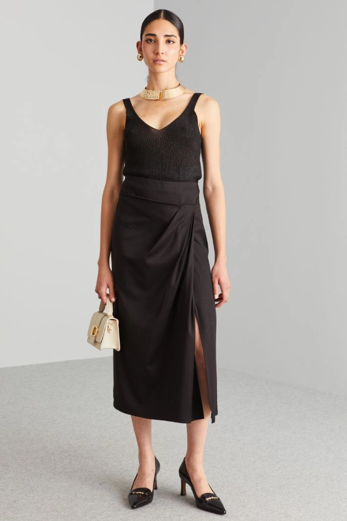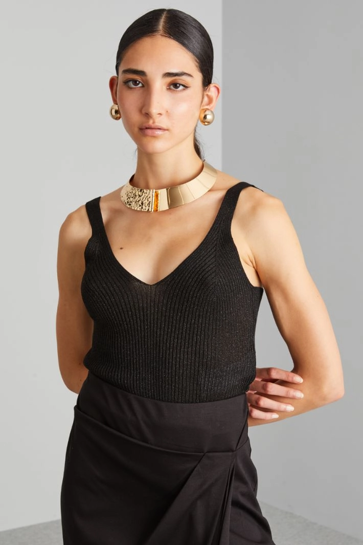 Slim-fit sleeveless cropped top in viscose blend knit with lamé yarn insert, ribbed knit, V-neck and thin straps.