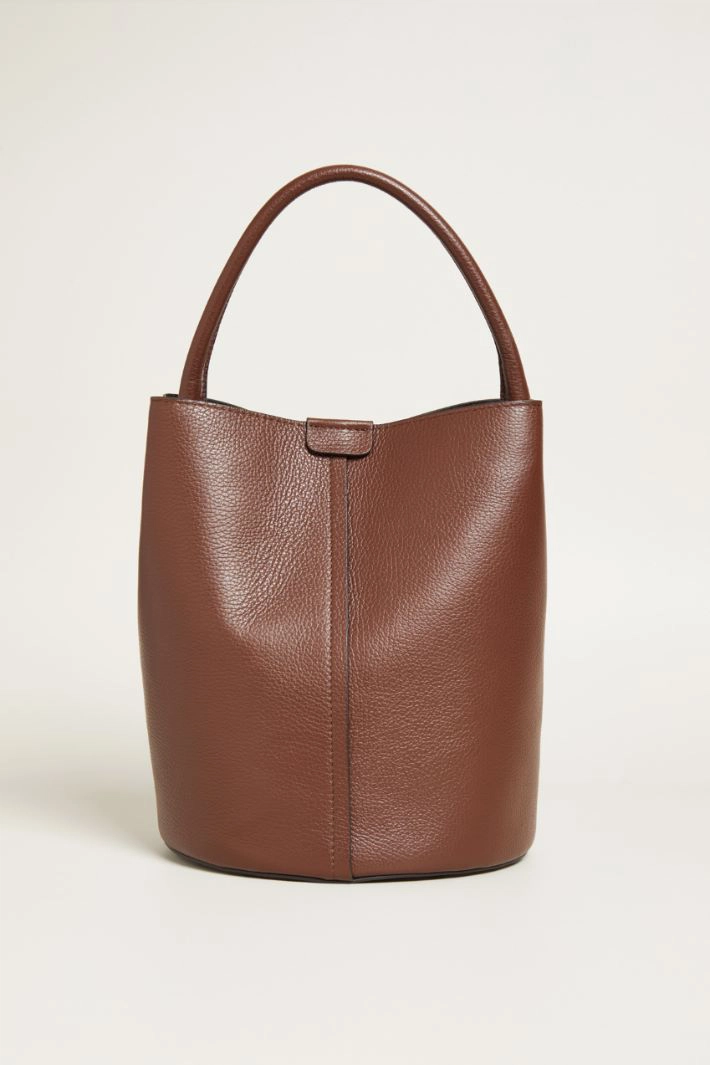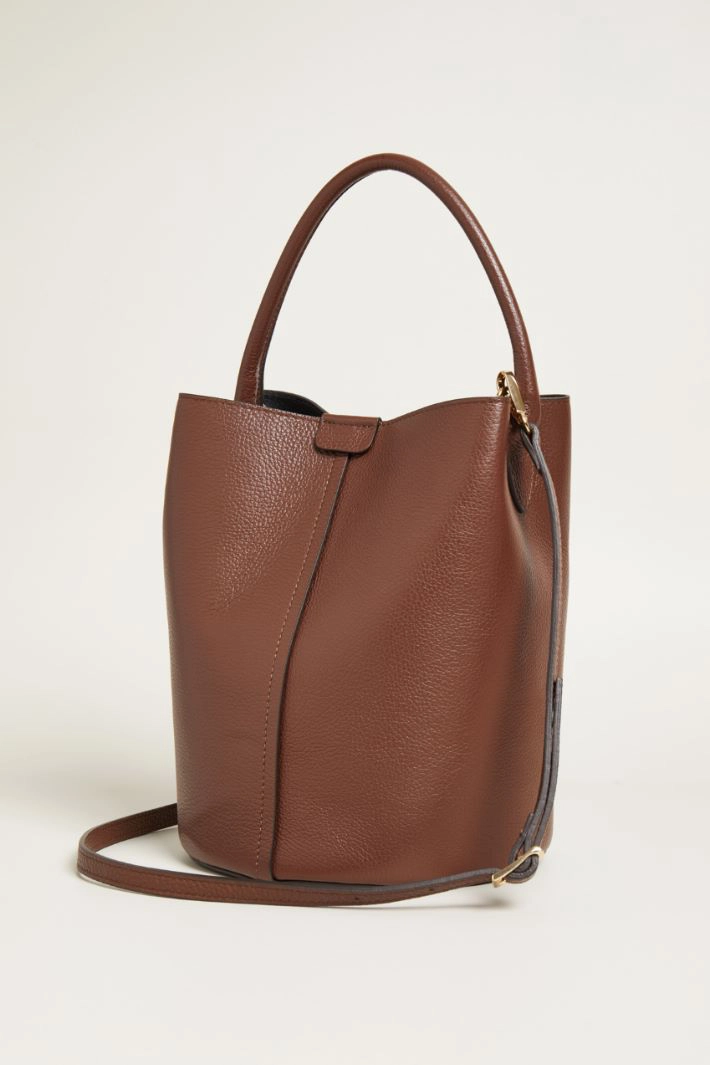 Leather bag with single handle and removable shoulder strap. Button fastening.