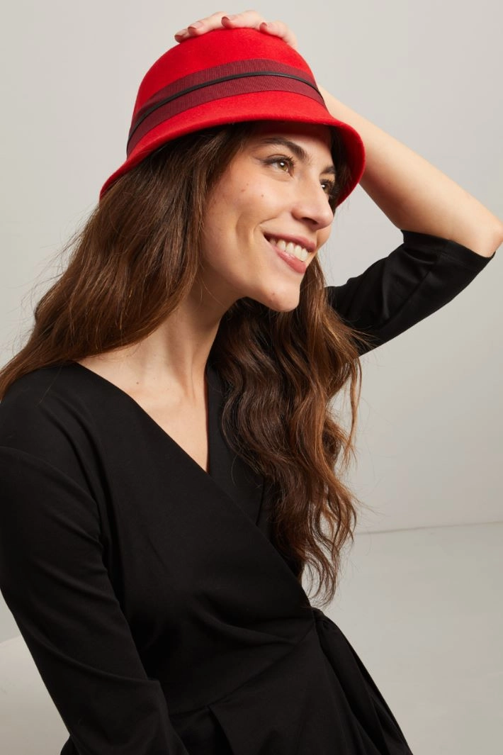 Cloche in pure wool felt, with grosgrain ribbon detail and cord with bow.