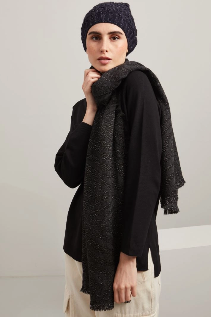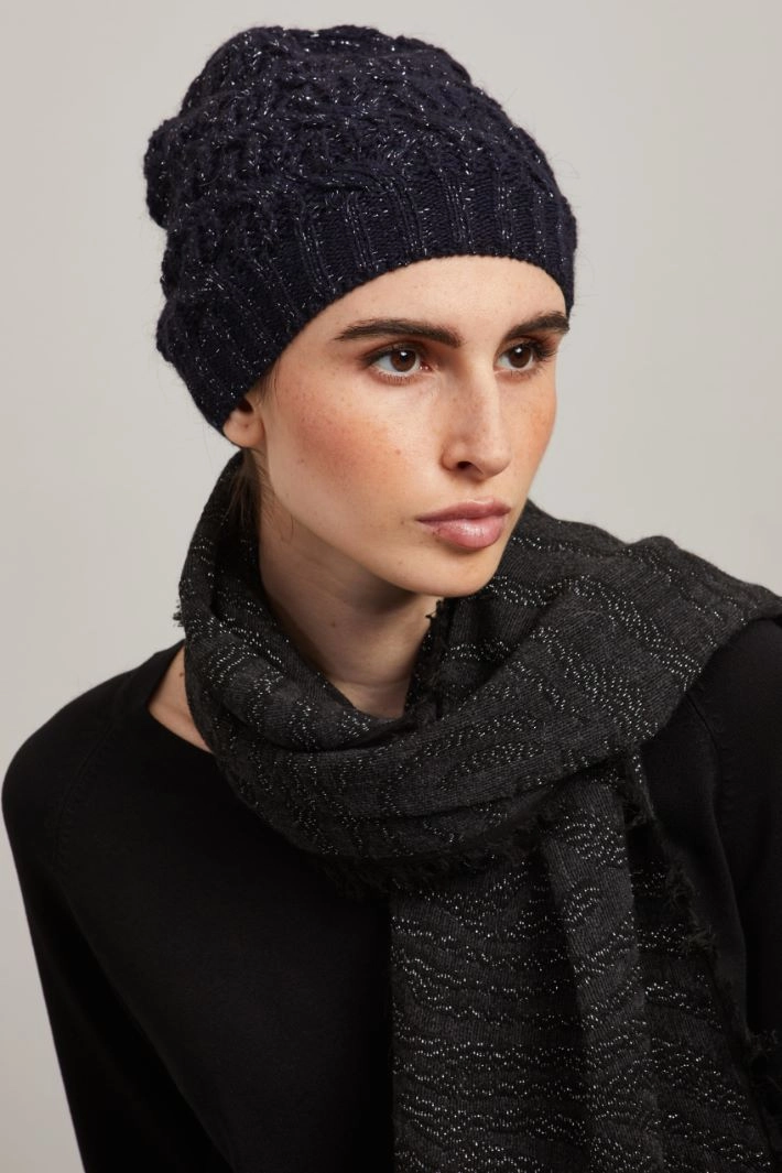 Beanie in wool, alpaca and viscose blend knit, with lurex yarn insert and cable knit.