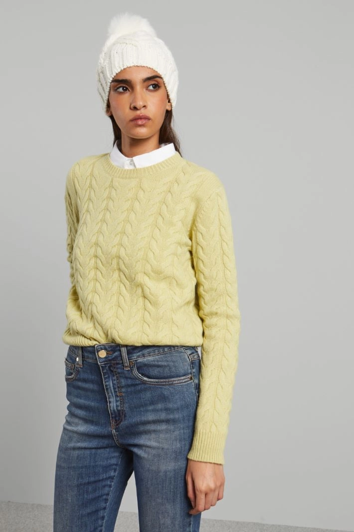 Beanie hat in alpaca, wool and viscose blend yarn, with cable knit and pom pom on top.