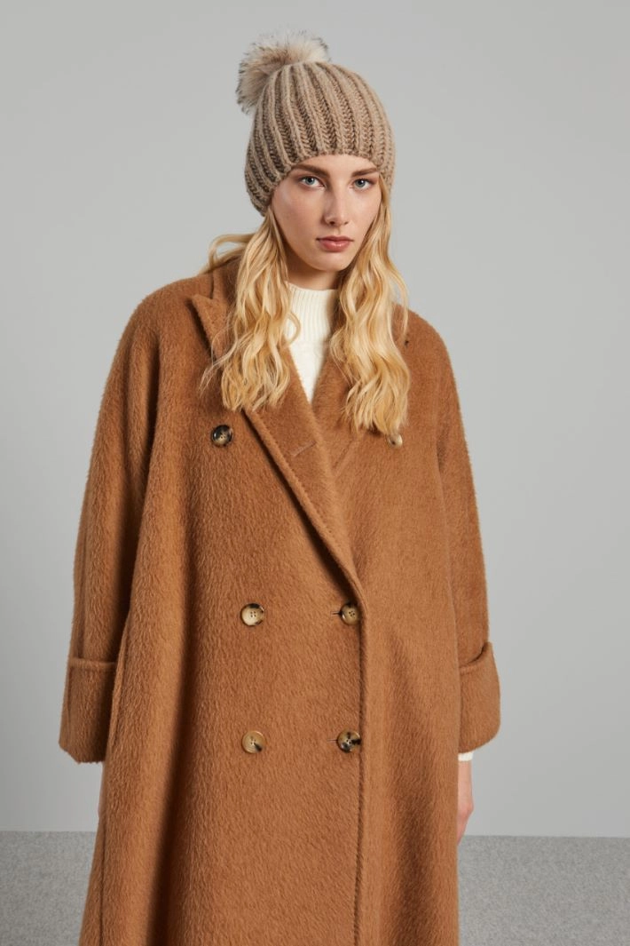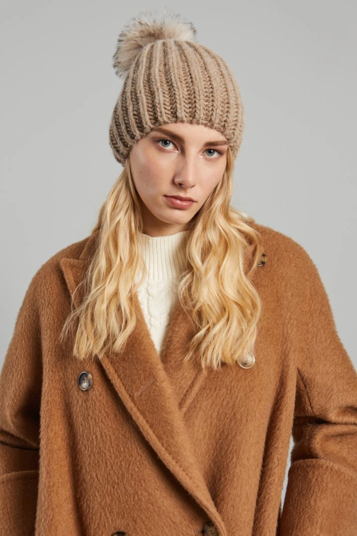 Beanie hat in wool, viscose and alpaca blend yarn with ribbed knit and pom pom on top.