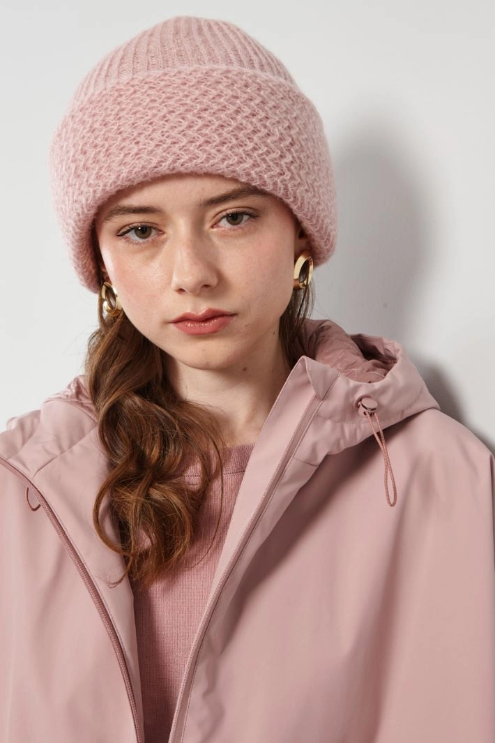 Beanie hat in mohair blend yarn with ribbing and turn-up at the bottom.