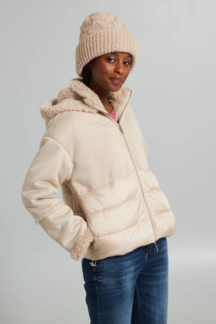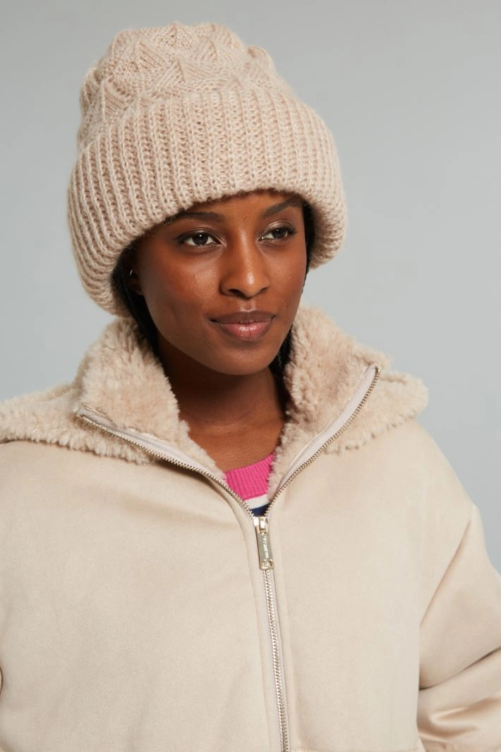 Oversized beanie hat in mohair blend yarn with lamé fiber insert, raised motif and turn-up at the bottom.