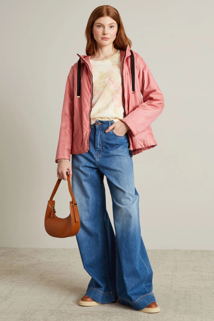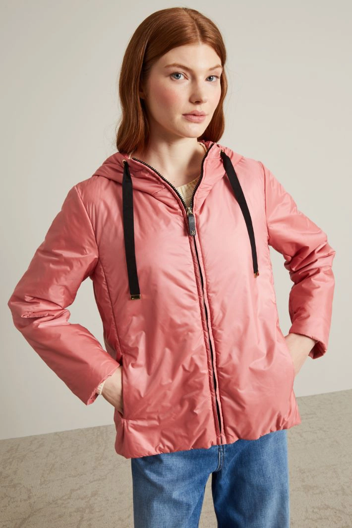 Short, straight-fit padded jacket in water-repellent technical satin, with drawstring hood, long sleeves, inset side pockets and zip fastening.